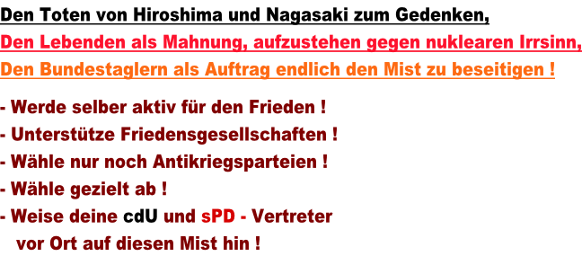 Wir sollten alle Parteien, die sich nicht klar und deutlich für die erheblichste Reduzierung / Beseitigung dieser Scheißdinger aussprechen ABWÄHLEN !. Dies betrifft vor allem die CDU, die sich nahezu uneingeschränkt allem Kriegs-