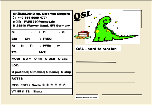 Zeichne oder entwerfe für dich und deinen Funk-Rufnamen eine eigene QSL - Karte. Mit dieser kannst du nach einem erfolgreich durchgeführten QSO (=Gespräch) deinem Gegenüber das geführte Gespräch bestätigen.